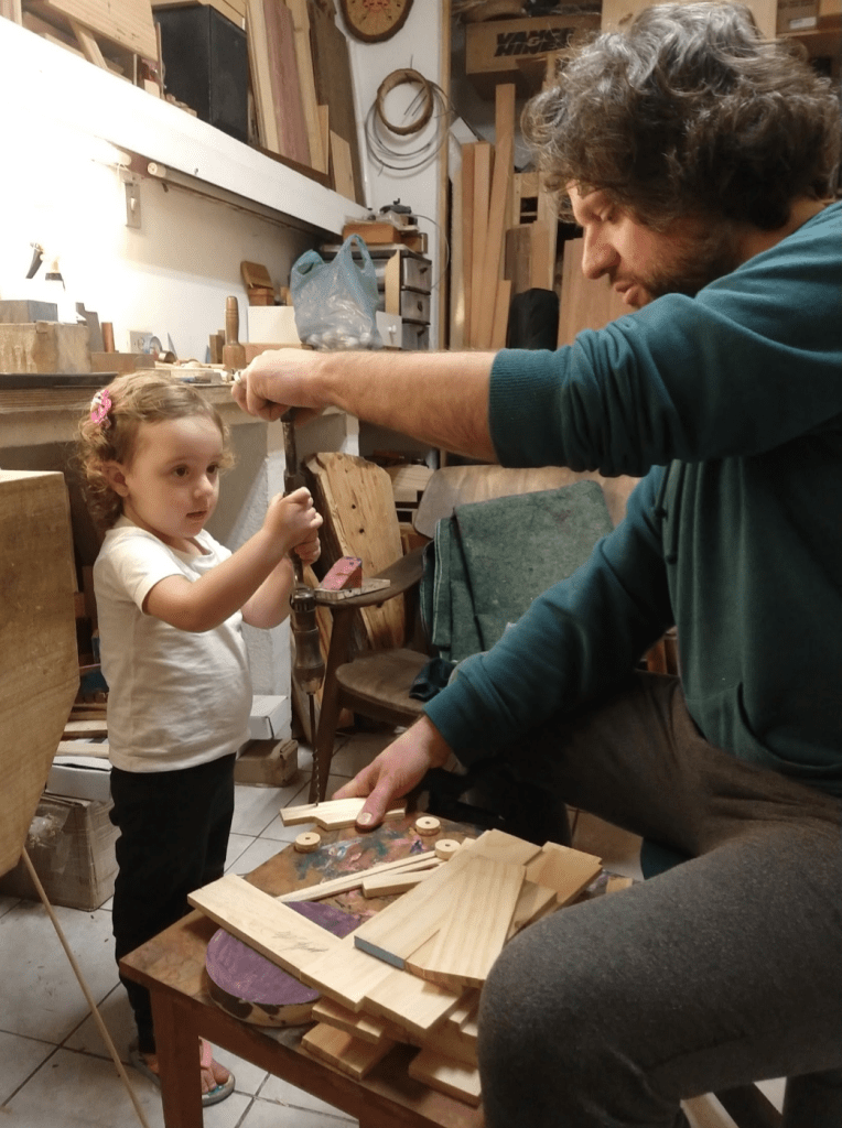 A paixão por marcenaria, na verdade, é essa paixão pelo encontro humano pelos materiais concretos e a possibilidade de nossas mãos, ao dedicar esforço e resiliência, de se relacionar com eles, poder produzir, poder trazer ao mundo algo real e belo (não só belo, pelo valor estético, mas belo por ser algo autêntico e real, mas que antes habitava outra espacialidade). Nossas mãos carregam essa possibilidade e acreditamos que essa é uma capacidade fundante do ser humano, ou seja, com o distanciamento cada vez maior dos processos manuais, acabamos nos separando de algo que nos constitui, de ser humano. O fazer e o saber com as mãos nos tornam mais humanos. E portanto, acreditamos em uma educação que passa pelos processos manuais, que valoriza os fazeres manuais e que sobretudo, na possibilidade das crianças (e adultos) experienciarem tais processos.